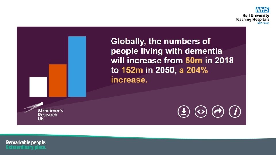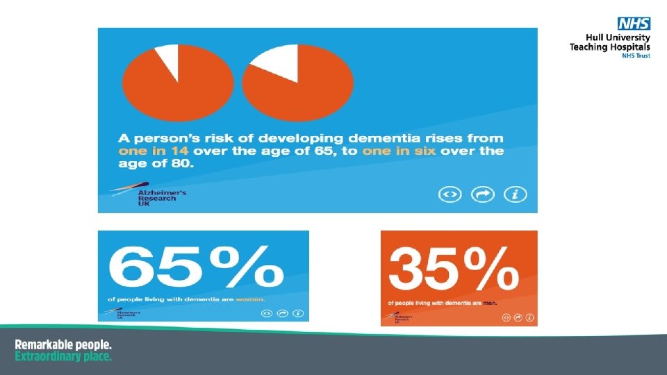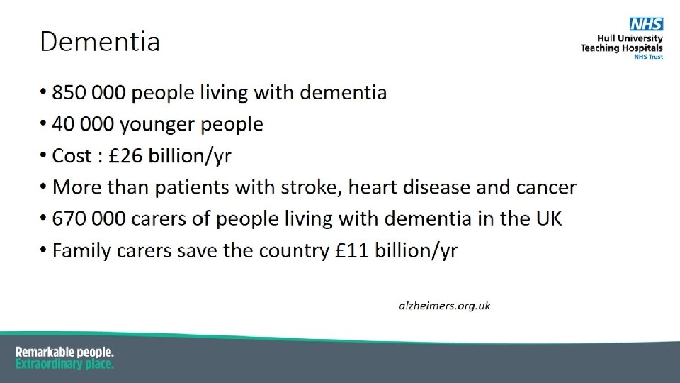 Patients with dementia : • Longer length of stay • Risk of hospital acquired harm higher • Mortality higher • Discharge process more complex • Readmission rates higher