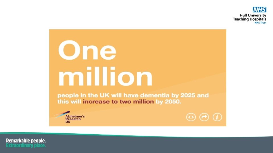 Stages Of Dementia Early Moderate Severe Advanced / end stage • MMSE 21 - 24 • STM loss • Disorientation • MMSE 11 – 20 • Assistance for personal cares • MMSE < 10 • “unable to have sensible conversation” • “does not recognise family members” • Nutritional problems / swallowing problems • Prone to infections • Poor physiological reserve