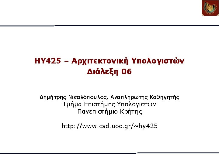 Unrolled Loop Detail • Do not usually know upper bound of loop • Suppose it is n, and we would like to unroll the loop to make k copies of the body • Instead of a single unrolled loop, we generate a pair of consecutive loops: – 1 st executes (n mod k) times and has a body that is the original loop – 2 nd is the unrolled body surrounded by an outer loop that iterates (n/k) times • For large values of n, most of the execution time will be spent in the unrolled loop 11/28/2020 ΗΥ 425 - Διάλεξη 06 21
