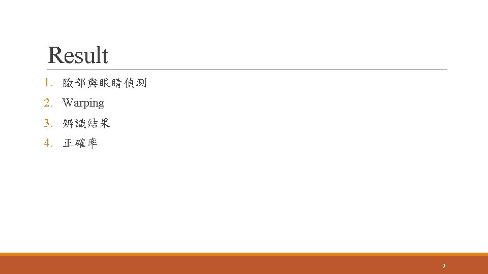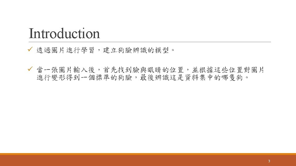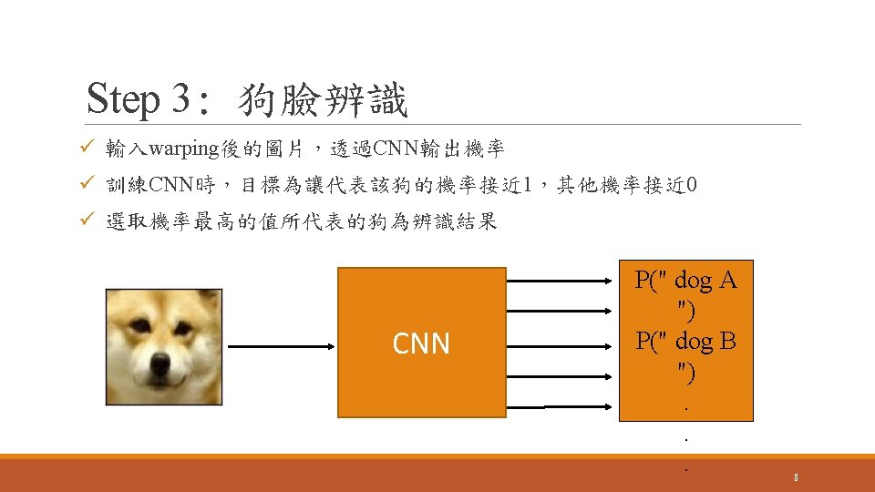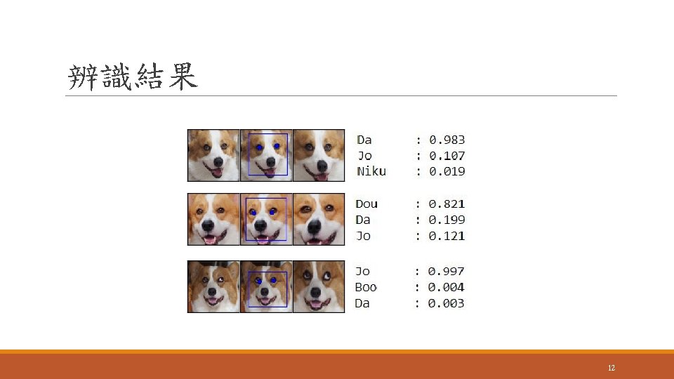 Outline Introduction Data Method Result Demo Conclusion 2 Slides: 15 Download presentation Outline ü Introduction ü Data ü Method ü Result ü Demo ü Conclusion 2 Data ü 從Facebook粉絲團截取圖片,8隻狗各40張圖片,共 320張 ü 手動標記臉部與眼睛位置 ü 每隻狗 30張圖片用於模型訓練,10張用於計算正確率 https: //www. facebook. com/Boo/ https: //www. facebook. com/taiwanlianhuanpao/ https: //www. facebook. com/niku 790305/ https: //www. facebook. com/Nanavsmedia/ 臉部與眼睛位置標註 https: //www. facebook. com/itsdougthepug/ https: //www. facebook. com/shiba. QJiang/ 4 Step 2: Warping ü 截取出臉的部分並warping到一個256*256標準臉的圖片 截取、warping 7 Warping 截取、warping 11 Demo ü 程式語言: Python ü 函式庫: Open. CV、Keras ü 開發環境: Jupyter notebook 14