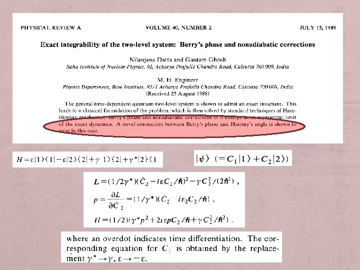 Developments of Berry phase Frank Wilczek and A. Zee* Phys. Rev. Lett. 52, 2111– 2114 (1984) “Appearance of Gauge Structure in Simple Dynamical Systems” The conception was generalized to degenerate system Y. Aharonov and J. Anandan Phys. Rev. Lett. 58, 1593– 1596 (1987) Phase change during a cyclic quantum evolution The conception was generalized to non-adiabatic evolution, so-called AA phase Berry phase and AA phase are all geometric phases, but when one mentions the geometric phase, it often means AA phase. What is meant by “geometrical” in the geometric phase? A physically observable feature of a quantum system that depends only on the path described during its evolution.