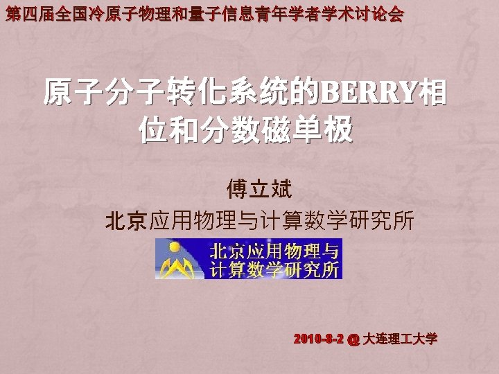 OUTLINE + Introduction -Review of Berry phase and conception of monopole + Berry phase of atom-molecule conversion system -Berry phase under mean-field treatment -Fractional monopole -Many-body effect of Berry phase -Hannay angle + Summary and discussion