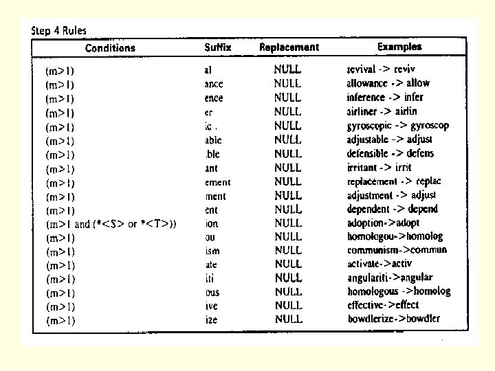The Porter algorithm n The Porter algorithm consists of a set of condition/action rules. n The condition fall into three classes Conditions on the stem n Conditions on the suffix n Conditions on rules n