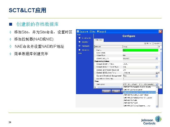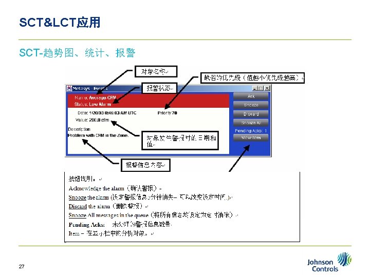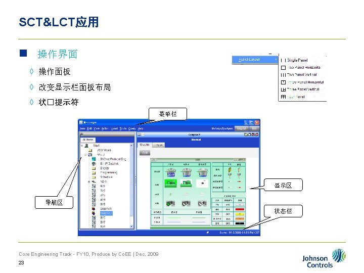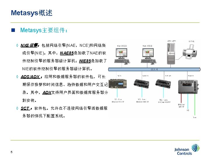 Outline n Metasys n NAE n SCT n Slides: 32 Download presentation Outline大纲 n Metasys 概述 n NAE简述 n SCT软件安装 n SCT&LCT应用 2 第 1章 n Metasys概述 ◊ Metasys主要组件 ◊ Metasys系统结构 ◊ Metasys系统配置 3 Metasys概述 n Metasys概述 ◊ Metasys主要�件 ◊ Metasys系��构 ◊ Metasys系�配置 4 Metasys概述 n Metasys概述 ◊ Metasys主要�件 ◊ Metasys系��构 ◊ Metasys系�配置 6 Metasys概述 n Metasys系统结构 用户界面 数据服务器 TCP/IP 网络控制器 MSTP BACnet N 2 VSD AHUs I/O 现场控制器 传感器 VMA Chiller LON 7 Fan Coils Metasys概述 n Metasys概述 ◊ Metasys主要�件 ◊ Metasys系��构 ◊ Metasys系�配置 8 Metasys概述 n 10 Metasys系统配置 NAE概述 n NAE概述 ◊ NAE 35介� ◊ NAE 45介� ◊ NAE 55介� ◊ NAE/NCE配置 12 NAE概述 n 13 NAE 35 xx NAE概述 n NAE概述 ◊ NAE 35介� ◊ NAE 45介� ◊ NAE 55介� ◊ NAE/NCE配置 14 NAE概述 n 15 NAE 45 xx NAE概述 n NAE概述 ◊ NAE 35介� ◊ NAE 45介� ◊ NAE 55介� ◊ NAE/NCE配置 16 NAE概述 n NAE 55 xx 17 NAE概述 n NAE概述 ◊ NAE 35介� ◊ NAE 45介� ◊ NAE 55介� ◊ NAE/NCE配置 18 SCT软件安装 n 安装说明: 举例是SCT 5. 0的安装,具体参照文档 <ADSADXand. SCTInstallationand. Upgrade. Wizard_LIT 12011521. chm> 21 第 4章 n SCT&LCT应用 22 SCT&LCT应用 n 完善数据库 ◊ 添加 N 2 /Field Bus Trunk ◊ 添加 FX设备(N 2)/FEC设备(BACnet) ◊ 添加 FX/FEC的I/O点 25 SCT&LCT应用 SCT-Object n AV n BV n MV n Interlock n Schedule n Global Data 29 SCT&LCT应用 SCT-LCT编程(Control System) 30 SCT&LCT应用 SCT-数据库备份 备份文件保存在如下路径: n C: Documents and SettingsAll UsersApplication DataJohnson ControlsMetasys. IIIDatabase. Files 31