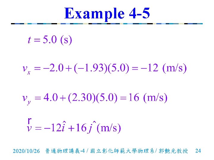 Example 4 -2 (a) At , the scalar components are so 2020/10/26 普通物理講義-4 / 國立彰化師範大學物理系/ 郭艷光教授 12