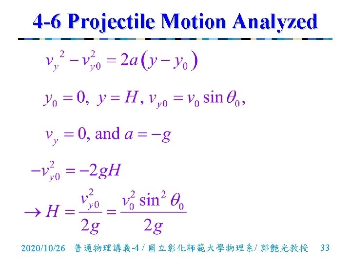 4 -6 Projectile Motion Analyzed n Maximum height H: 2020/10/26 普通物理講義-4 / 國立彰化師範大學物理系/ 郭艷光教授 32