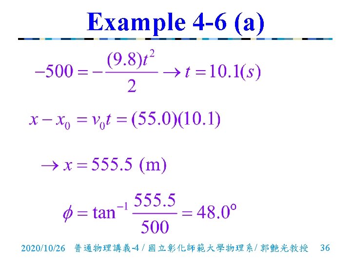 Example 4 -6 (a) n The pilot wants to release a rescue capsule so that it hits the water very close to the victim. What should be the angle of the pilot’s line of sight to the victim when the release is made? n Solutions: 2020/10/26 普通物理講義-4 / 國立彰化師範大學物理系/ 郭艷光教授 35