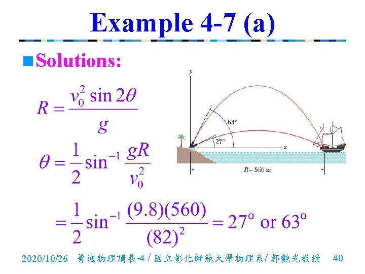 Example 4 -7 (a) n. A pirate ship 560 m from a fort defending the harbor entrance of an island. A defense cannon, located at sea level, fires balls at initial speed v 0 = 82 m/s. At what angle from the horizontal must a ball be fired to hit the ship? 2020/10/26 普通物理講義-4 / 國立彰化師範大學物理系/ 郭艷光教授 39