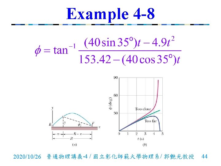 Example 4 -8 assuming that the outfielder is already positioned to catch the ball, is 6. 0 m too close to the batter, and is 6. 0 m too far away. n Solutions: 2020/10/26 普通物理講義-4 / 國立彰化師範大學物理系/ 郭艷光教授 43