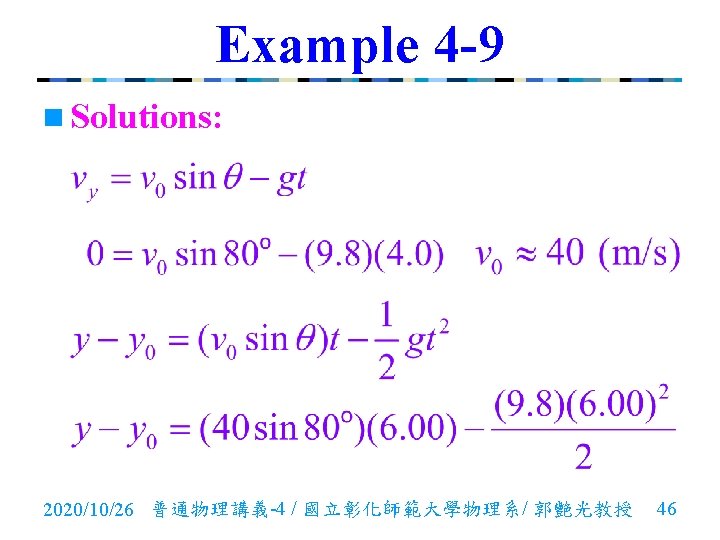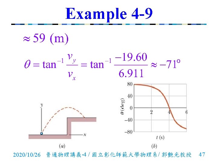 Example 4 -9 n At time = 0, golf ball is shot from ground level into the air, as indicated in Fig. (a). The angle between the ball’s direction of travel and the positive direction of the x axis is given in Fig. (b) as a function of time t. The ball lands at t = 6. 00 s. What is the magnitude of the ball’s launch velocity, at what height above the launch level does the ball land, and what is the ball’s direction of travel just as it lands? 2020/10/26 普通物理講義-4 / 國立彰化師範大學物理系/ 郭艷光教授 45