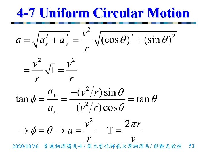 4 -7 Uniform Circular Motion using the right triangle in Fig. (a), we can replace with and with to write 2020/10/26 普通物理講義-4 / 國立彰化師範大學物理系/ 郭艷光教授 51