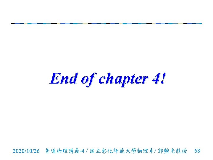 Example 4 -6 (b) n As the capsule reaches the water, what is its velocity in unit-vector notation and in magnitude-angle notation? n Solutions: 2020/10/26 普通物理講義-4 / 國立彰化師範大學物理系/ 郭艷光教授 37