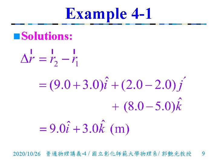 Example 4 -1 n The position vector for a particle initially is and then later is What is the particle’s displacement from to. 2020/10/26 普通物理講義-4 / 國立彰化師範大學物理系/ 郭艷光教授 8