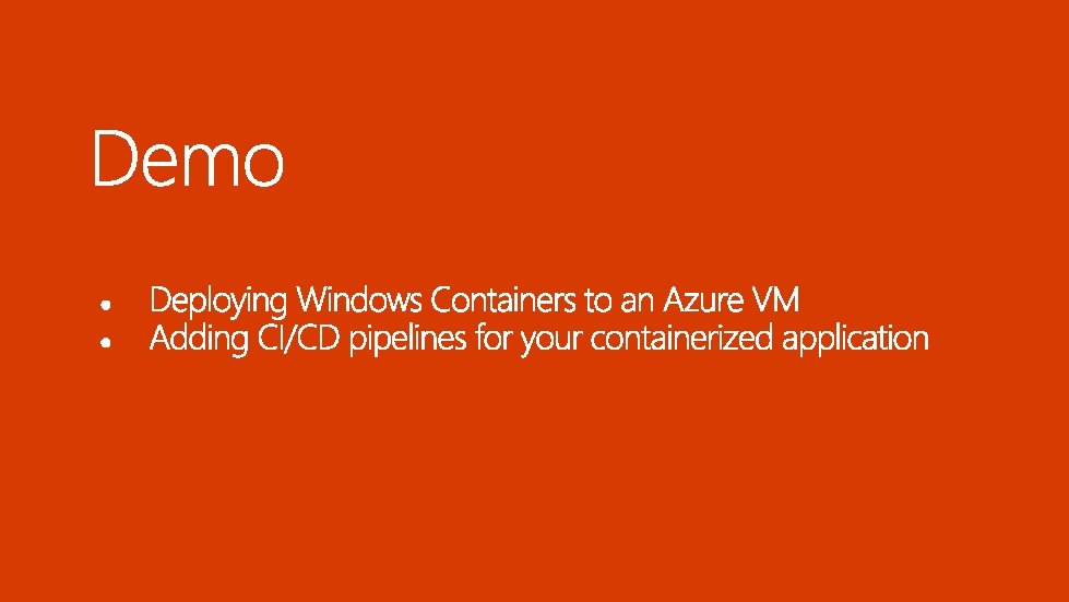Scenario: Deploy to Azure VM through a Docker Registry Microsoft Azure Docker Registry PC Dev Environment VM for Test Environment Windows 10 or later Docker for Windows ASP. NET (. NET Framework) on Windows Server Core Container Windows Server 2016 or later Docker Engine Docker Hub or Azure Container Registry Docker engine and Docker CLI docker push Docker-compose up docker pull SQL Server on Windows Server Core Container Local Docker Image Repository (*) docker-compose build or docker build (*) SQL Server in a container should only be used for dev/test environments. Move to high available systems, like Azure SQL Database, for production environments