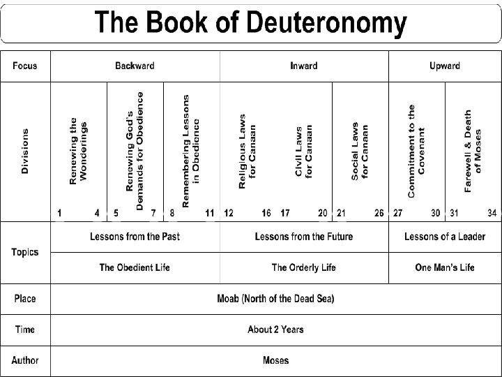 Outline of Deuteronomy • History of the Covenant (1: 1 – 4: 43) • Stipulations of the Covenant (4: 44 – 26: 19) – Moral Law (4: 44 – 11: 32) – Ceremonial Law (12: 1 – 16: 17) – Civil Law (16: 18 – 26: 19) • Ratification of the Covenant (27: 1 – 30: 20) • Leadership Succession Under the Covenant (31: 1 – 34: 20)