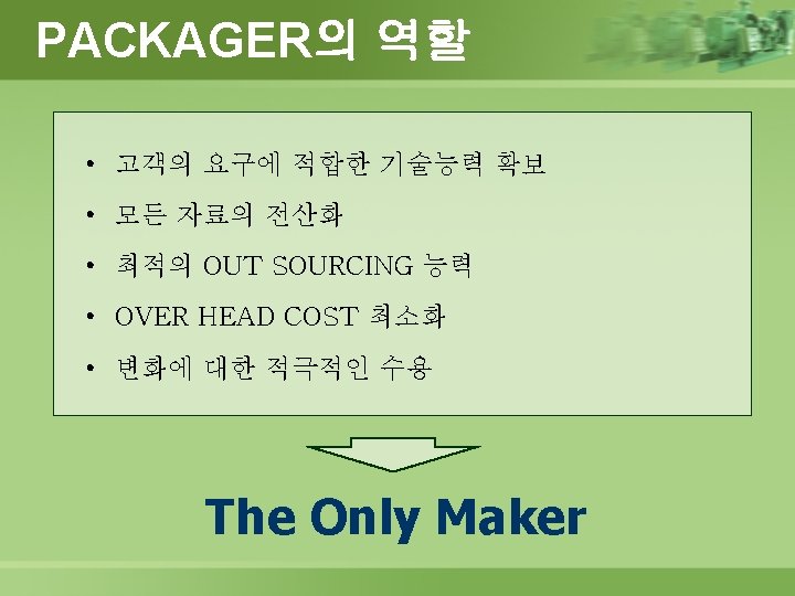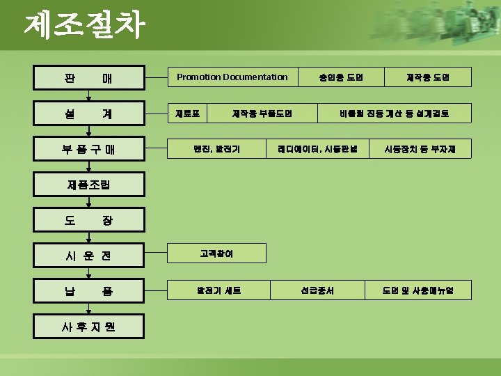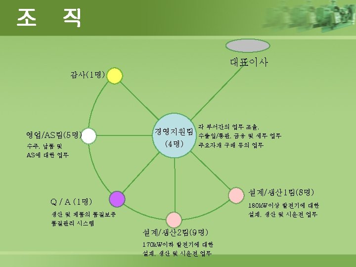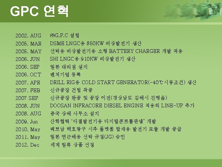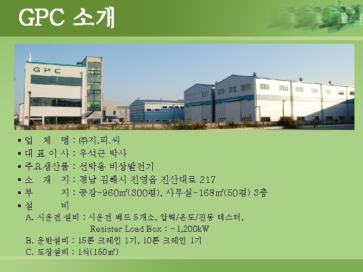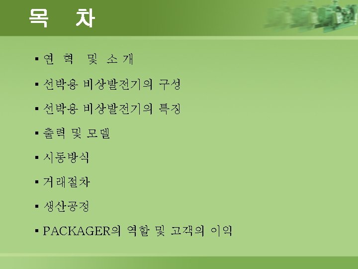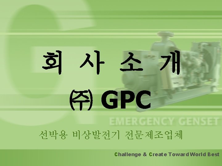 비상발전기의 구성 • Outline of Emergency Generator Expansion Joint Turbocharger Air Filter Radiator Auto Starting Control Panel Battery Charger Fuel Pump & Governor Battery With Box Generator Diesel Engine Lube Oil Pump Fuel Inlet Spring Starter Vibration Isolator Common Bed