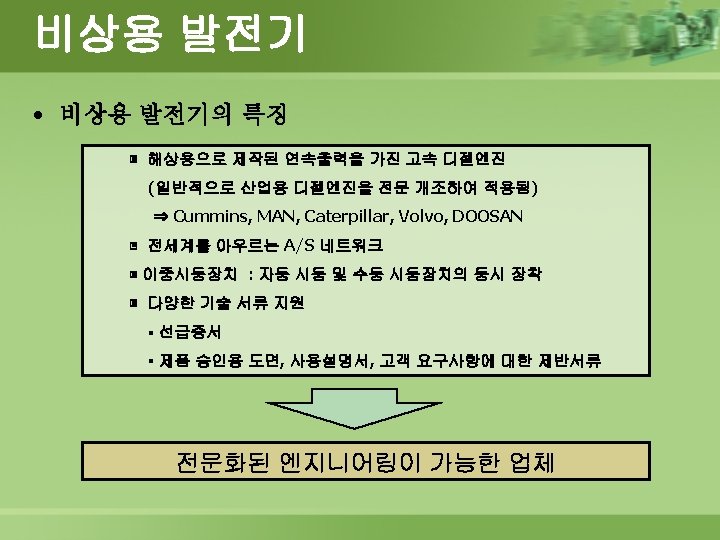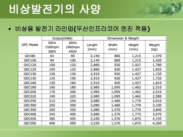 비상발전기의 사양 • 수동(2차) 시동장치 k. W AD 066 TI AD 136 TI AD 086 TI AD 126 TI AD 158 TI AD 180 TI 60~100 105~125 130~160 170~220 250~300 350~450 Battery Spring Hydraulic Maker Standard Maker Option ※ 일반적으로 자동시동장치로는 배터리와 전기모터가 채용됨
