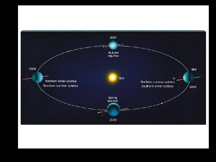 Question 1 If Uranus it is at its Autumnal Equinox, what does that mean? a) Nothing, Uranus has no seasons b) The Sun is crossing Uranus’ equator from North to South c) The Sun is at its northernmost point on Uranus d) The Sun is in the southern hemisphere of Uranus