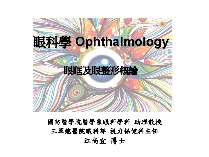 ※ Chronic Dacryocystitis • Etiology. Obstruction of the nasolacrimal duct is often secondary to chronic inflammation of the connective tissue or nasal mucosa. • Symptoms and diagnostic considerations. The initial characteristic is increased lacrimation. Signs of inflammation are not usually present. Applying pressure to the inflamed lacrimal sac causes large quantities of transparent mucoid pus to regurgitate through the punctum. • Treatment. Surgical intervention is the only effective treatment in the vast majority of cases. This involves either a dacryocystorhinostomy (DCR 淚囊鼻腔吻合術) (creation of a direct connection between the lacrimal sac and the nasal mucosa) or removal of the lacrimal sac. 10/30/2021 48