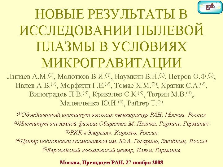 MPE and IHED scientific teams are very much appreciated to all specialists from DLR, Roscosmos, RSCE “Energia”, Gagarin Cosmonaut Training Centre, Moscow Mission Control Centre, Kayser -Threde who made possible “Plasma Crystal” experiments. Very special thanks to cosmonauts who made the decisive steps in the experiments realization from January 1998 1. 2. 3. 4. 5. 6. 7. 8. 9. 10. 11. 12. 13. 14. Vinogradov P. V. Soloviev A. Ya. Budarin N. M. Musabaev T. A. Baturin Yu. M. Avdeev S. V. Padalka G. I. Kalery A. Yu. Zaletin S. V. Krikalev S. K. Gidzenko Yu. P. Shepherd W. Usachev Yu. I. Tyurin M. V. PK-1, PK-3 Plus PK-1, PK-3 twice PK-1, PK-3 PK-2, PK-3 PK-2 PK-3 twice PK-3, PK-3 Plus 15. 16. 17. 18. 19. 20. 21. 22. 23. 24. 25. 26. 27. 28. Dezhurov V. N. Onufrienko Yu. I. Kozeev K. M. Haignere C. Tretschev S. E. Korzun V. G. Malenchenko Yu. I. Sharipov S. Sh. Tokarev V. I. Reiter T. Yurchichin F. N. Kotov O. V. Volkov S. A. Kononenko O. V. PK-3 PK-3, PK-3 Plus twice PK-3 Plus PK-3 Plus