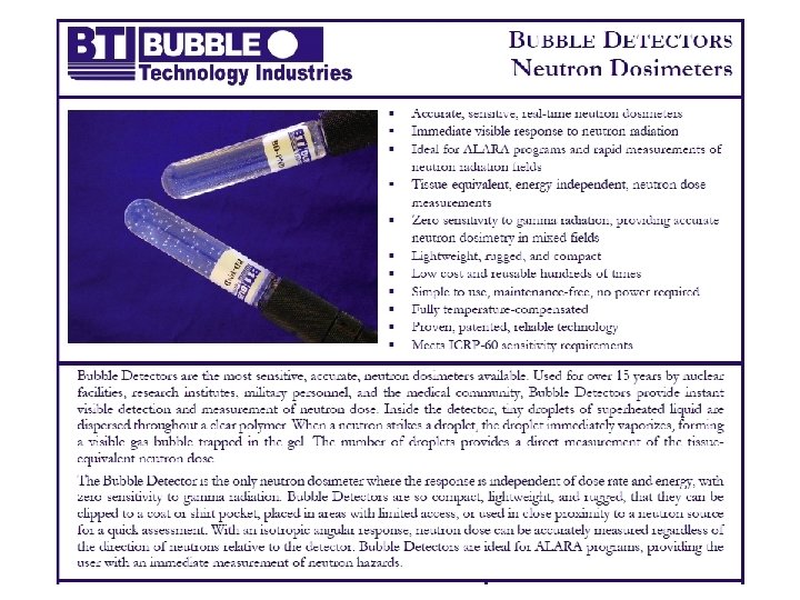 Neutron Detector Summary Moderated neutron counters are easy to use, sensitive, and measure dose equivalent (H) with reasonable accuracy. However, they are bulky and difficult to incorporate into a patient phantom. They are generally used to measure H near the target volume or to monitor the low dose in radiation-worker or public areas. Bubble counters are small, inexpensive, reusable and real-time. They can be inserted into a phantom and measure H reasonably well. They are sensitive enough to measure dose to the patient and radiation workers. Large plane-parallel ion chambers can be used to measure D if it is known a priori that it is mostly from neutrons. In that case, they are simple and absolute. Track-etch detectors are the most common commercial monitor for radiation protection. They are not very sensitive, but can give some information on RBE. Tissue-equivalent proportional counters (TEPC’s) used with microdosimetry techniques give by far the most information about the radiation field. The equipment is commercially available. However, data collection and interpretation are relatively complicated and best left to the experts. Silicon-on-insulator (SOI) microdosimetry arrays are compact but not yet commercially available. The relatively high charge threshold should not be a problem for neutrons.