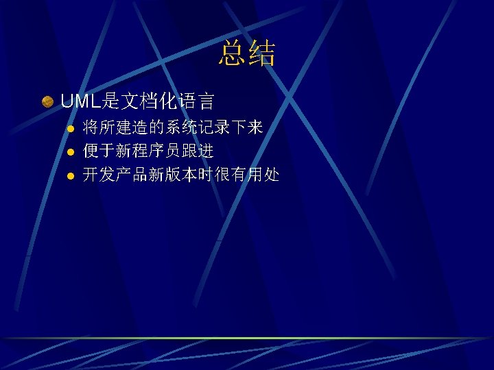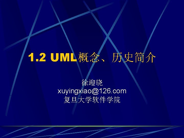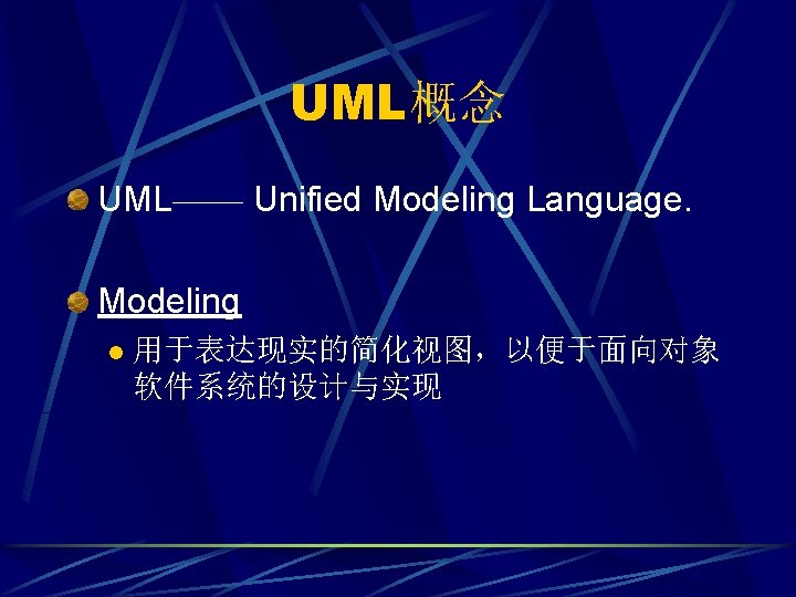 UML概念 Unified 组合了当前最好的面向对象软件建模方法 l Grady Booch, James Rumbaugh, and Ivor Jacobson,UML三位主要贡献者 l 1. OMT (James Rumbaugh) l 2. The Booch method (Grady Booch) l 3. OOSE (Ivar Jacobson) l