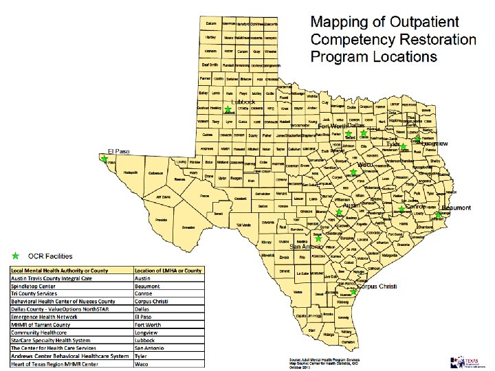 OCR: Eligibility • Deemed incompetent to stand trial • Misdemeanor or felony Offenses • Ineligibility • Deemed a danger to self or others • Refusal of medication • Brain damage or cognitive deficits that contribute to non -restorability • Intellectual and Developmental Disabilities that contribute to nonrestorability