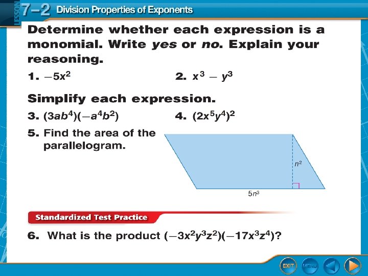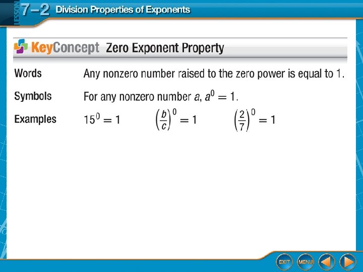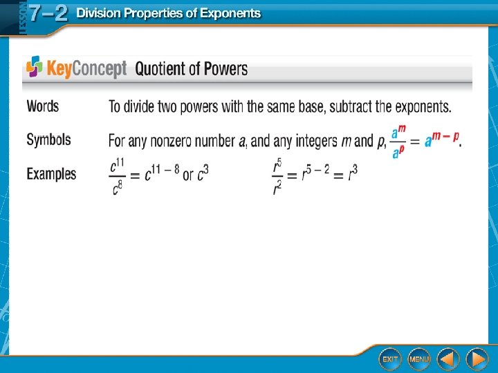 Zero Exponent B. a 0 = 1 Simplify. =n Answer: n Quotient of Powers