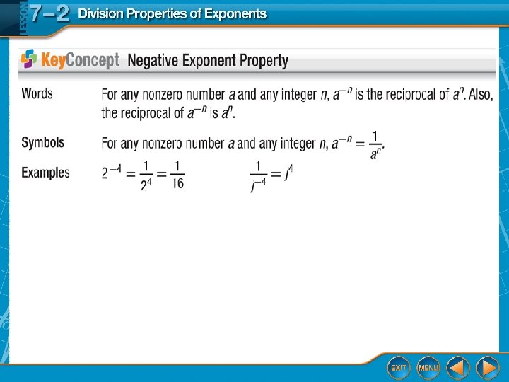 • zero exponent – any non-zero number raised to the zero power equals 1. • negative exponent – for any real number a ≠ 0 and any integer n, • order of magnitude – the order of magnitude of a quantity is the number rounded to the nearest power of ten. Example: The order of magnitude of 45, 000 is closest to 10, 000.