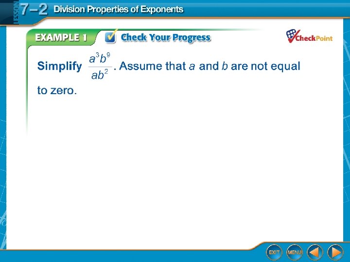 Negative Exponents B. Simplify . Assume that p, q and r are not equal to zero. Group powers with the same base. Quotient of Powers and Negative Exponent Property