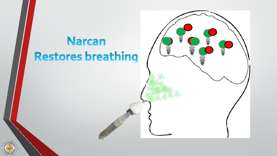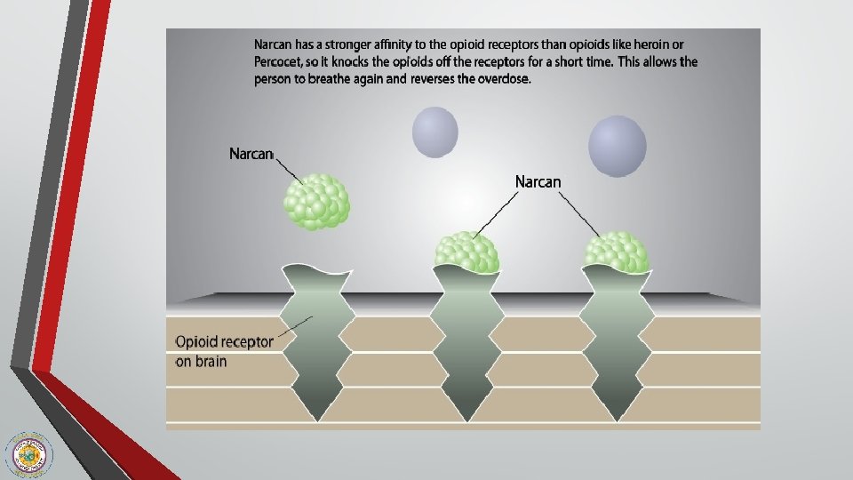 NALOXONE (Narcan) ü ü ü Naloxone knocks the opiate off the opiate receptor- it does nothing other than blocking opiate receptors Temporarily takes away the “high, ” giving the person the chance to breathe Naloxone works in 1 to 3 minutes and lasts 30 to 90 minutes