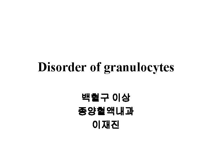 Neutropenia § Severity § § <200: no inflammation, normal flora 감염흔함 <500/microliter: severe 500 -1000/microliter: moderate 1000 -2000/microliter: mild § Ex § Iatrogenic, anticancer drug, hapten § 5 -7일에 호전, 10일에 완쾌 § Never try diagnositc invasive challenge § Lab § CBC, DC, BM exam § Tx § § § Aggressive culture, broad spectrum antibiotics, I & D Care oral hygiene G-CSF Prophylactic antibiotics: septrim for PCP, antifungal Granulocyte trunsfusion