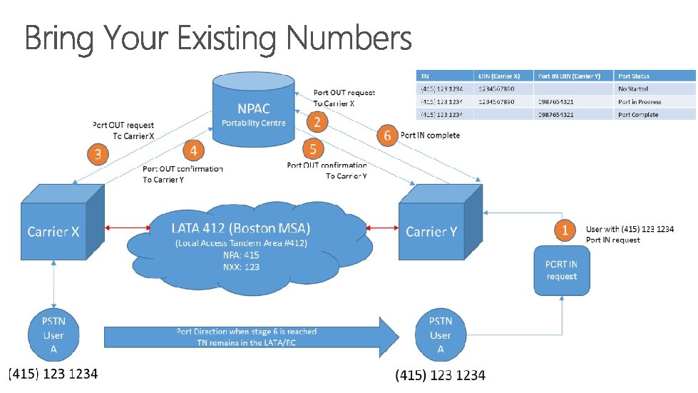 New numbers acquisition designed for maximum simplicity • • Search by state/area code for the numbers you want. Add them to your organization’s inventory. You can acquire more numbers than licenses to have some head room for changes. Telephone numbers will be available for area codes across the 50 states. Number porting to move existing numbers into Skype for Business • • FCC rules require that current carrier allows and provides a centralized body (NPAC) to transact moves. Losing carriers set different requirements to approve a move – the process can be complex