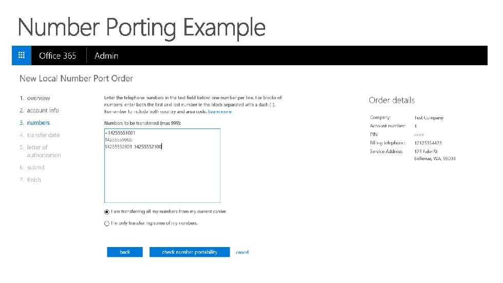 Standard Porting Project Porting Complex Porting Single order with <100 Telephone Numbers Single order with more than >100 Telephone Numbers Single order with >999 Telephone Numbers Single BTN, single address, single losing Carrier and single rate center Multiple BTNs, multiple addresses, single losing Carrier and multiple rate centers Generally gets completed within 7 business days provided no rejections for the Port Order Requires manual handling, generally gets completed within 34 weeks provided no rejections for the Port Order Supported by Skype for Business Admin Center Supported by Skype for Business Help Desk For large moves: Do a standard port (e. g. 1 number) early in migration project to validate you have right information to get approval from losing carrier.