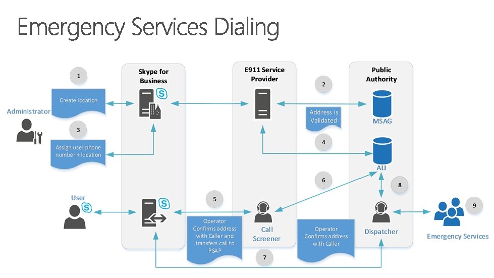 Integrated E 911 Calling Integrates with E 911 service provider & public safety access point (PSAP). Location Required Location must be defined when users are assigned a phone number. Create locations for all sites upfront and then assign when new users are added. Clients Rich clients: 911 calls sent to national screening center, caller location retrieved & transferred to PSAP. Mobile clients: 911 calls will be sent through mobile carrier.
