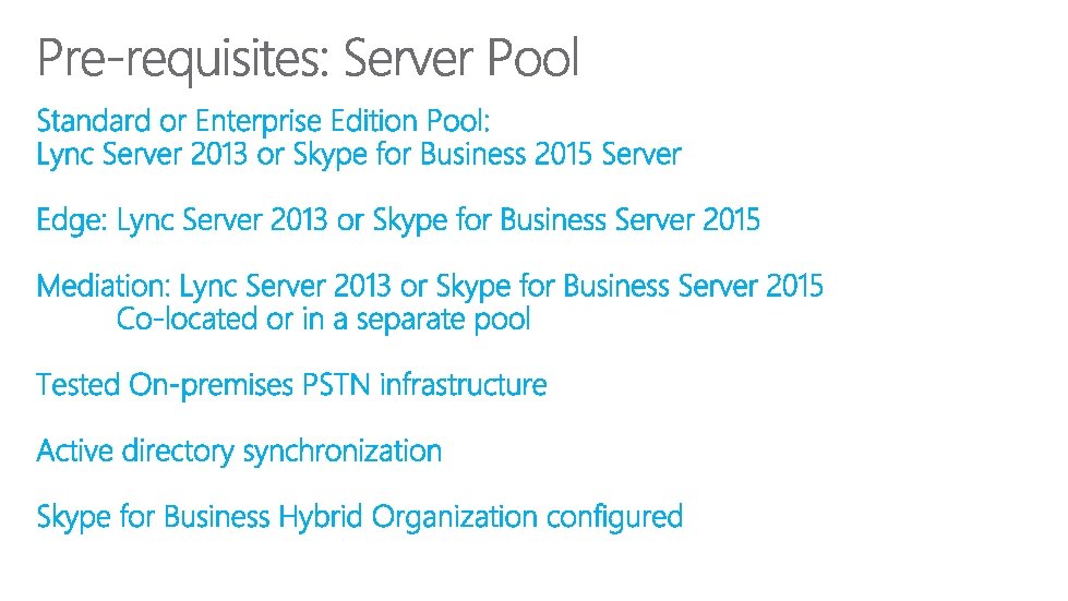 Existing Customer Server Pool New Customer Server Pool Cloud Connector Edition* Partner Appliance Cloud Connected Appliance Connect existing topology to Office 365 using Split Domain & migrate users to Cloud PBX. Deploy Skype for Business Server and connect it with Office 365. Packaged VMs on Customer Hardware provides PSTN connectivity components with Office 365. Future offering where partner packages required Skype for Business Server software or VMs with SBC/Gateway Future offering where PSTN connectivity is bundled with network management and quality of service telemetry for O 365. Cloud PBX user’s PSTN Traffic transits pool. Customers can operate additional services on-prem (VIS, etc. ) Cloud PBX users PSTN Traffic transits VMs *Cloud Connector Edition is in customer validation with our early adopter program and will be available in the coming months