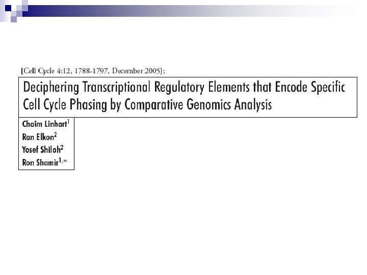 Human Cell Cycle Revisited n We detected global enrichments that pointed to major TFs in human cell cycle regulation. n However, we did not report on specific target genes due to high rate of false positive hits. n Comparative Genomics greatly boosts the specificity of in-silico detection of regulatory elements. n It now allows us to pinpoint TF targets with high confidence.