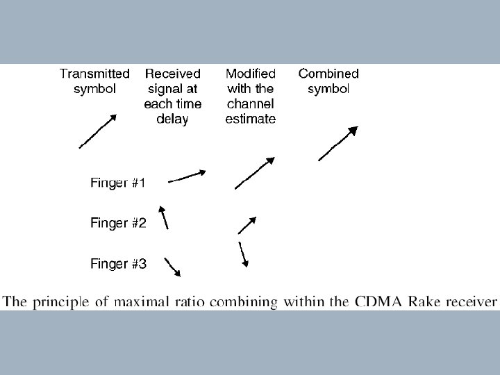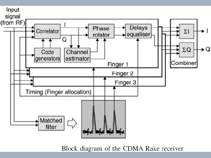 o Delay equliser n o the delay is compensated for the difference in the arrival times of the symbols in each finger Rake combiner n sums the channel compensated symbols, thereby providing multipath diversity against fading