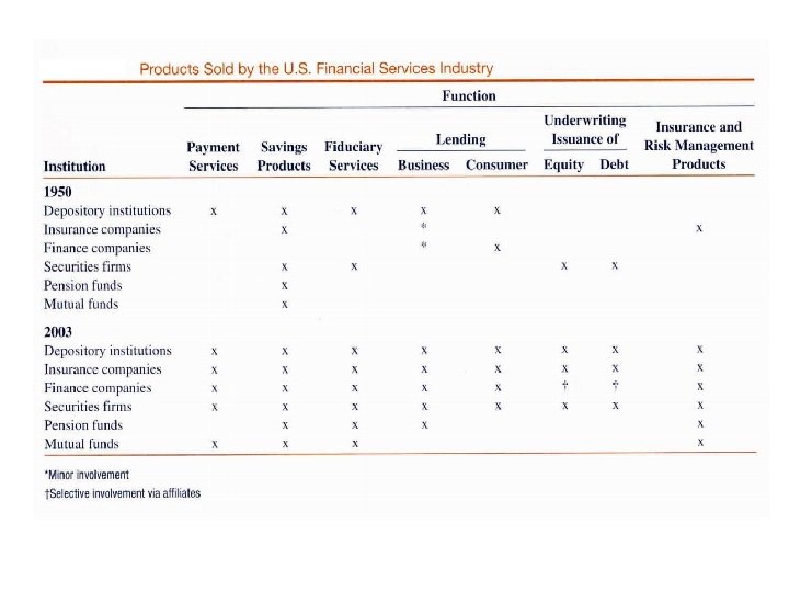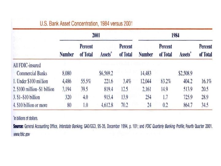 1999 Financial Services Modernization Act • Financial Services Modernization Act – Allowed banks, insurance companies, and securities firms to enter each others’ business areas – Provided for state regulation of insurance – Streamlined regulation of BHCs – Prohibited FDIC assistance to affiliates and subsidiaries of banks and savings institutions – Provided for national treatment of foreign banks