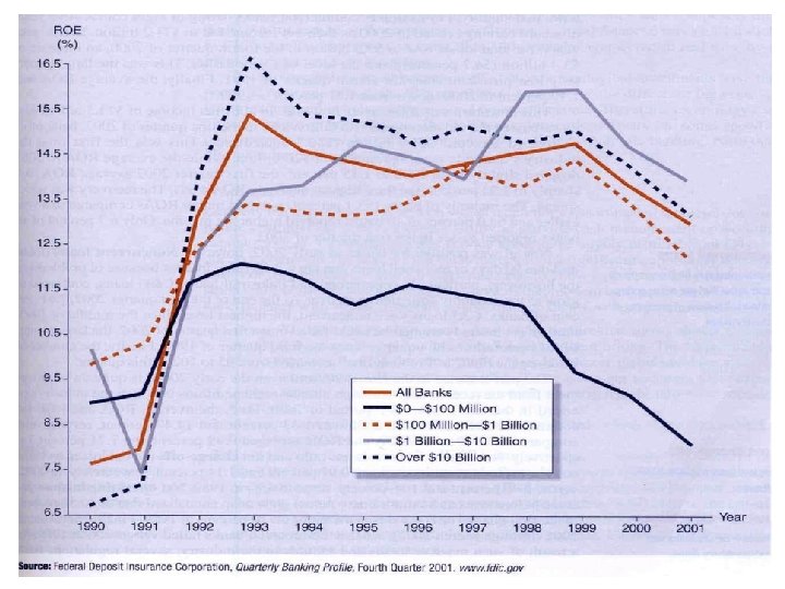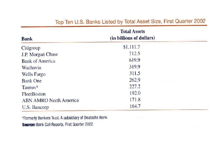 Bank Size and Activities • Large banks have easier access to capital markets and can operate with lower amounts of equity capital • Large banks tend to use more purchased funds (such as fed funds) and have fewer core deposits • Large banks lend to larger corporations which means that their interest rate spread is narrower – the difference between lending and deposit rates • Large banks are more diversification and generate more noninterest income