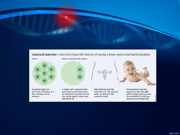 Summary • The debate about having designer babies continues; whether acceptable or not. • It is important for parents to accept that the “perfect baby” can be difficult to achieve • Could be useful in avoiding certain abnormalities