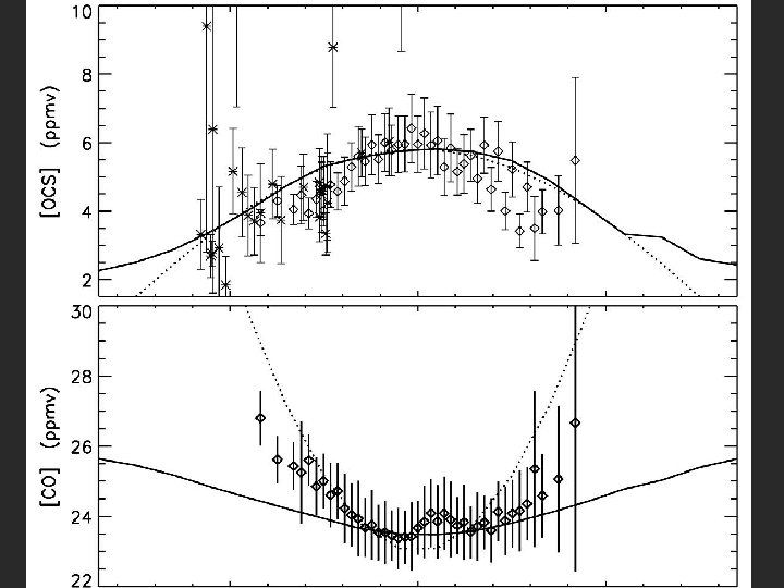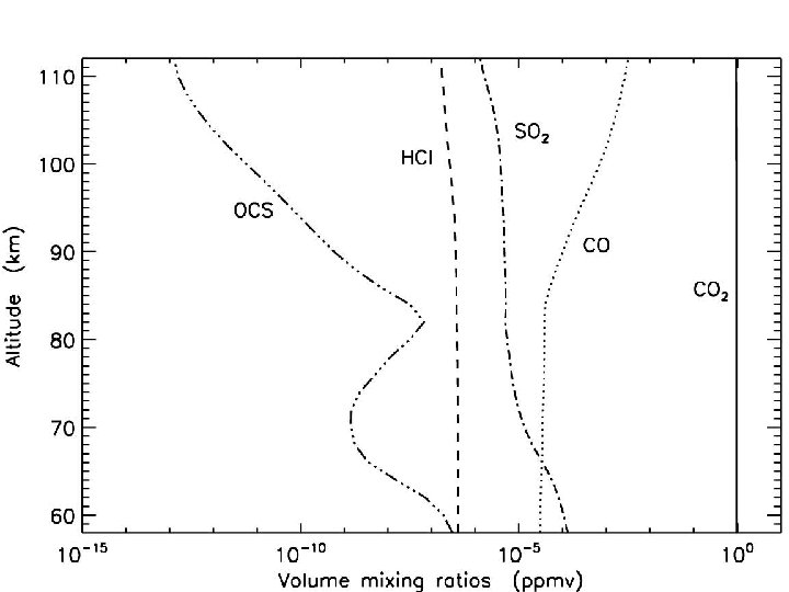 Mars’ atmosphere: basic chemistry * Detection of CO (1968) O 3 (1971), and O 2 (1972) * Detection of O 2 1. 27 emission in 1976 tracer of ozone (and not vice versa!) *CO 2 + h CO + O *O + M O 2 *O 2 + O + M O 3 *H 2 O + h OH +H *CO + OH CO 2 + H (stability of atmosphere) *OH HO 2 H 2 O 2 (not detected before 2005) Noxon et al. 1976