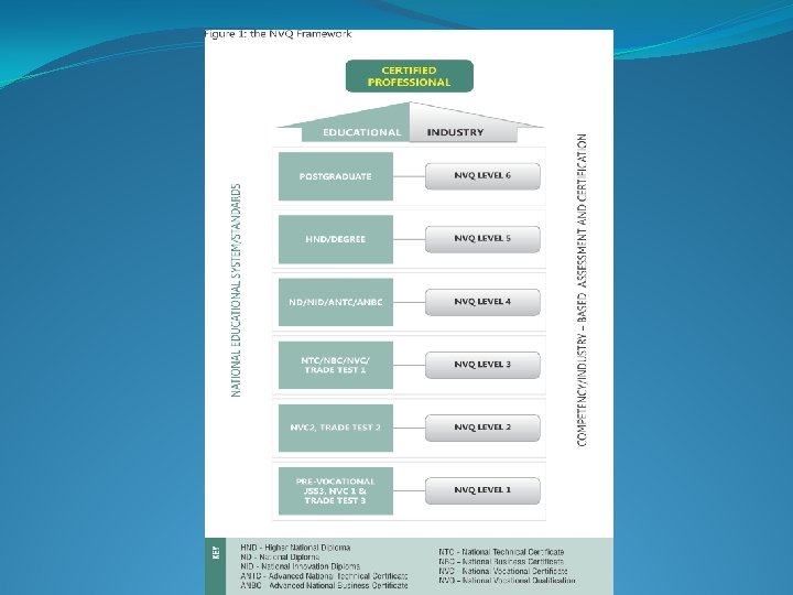 The Prospects of NSQF in Nigeria The development and institutionalization of NSQF will: �Provide policy guidelines on organizing skills training to improve product quality, productivity and competitiveness in both formal and informal sector �Provide a coherent structure for vocational qualifications, which are based on employment led standards of competence �Increase industry ownership of the traineeship system which enhance stakeholders input to major decisions �Determine the levels of award, which enable clear routes of progression, and appropriate awards, which relate to employment �Determine convenient systems for recognition of prior achievement