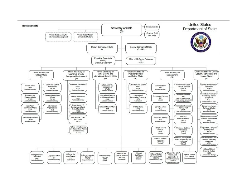 State’s Internal Chain of Command Secretary of State C Counselor U/S A/S P E USAID Deputy Secretary D T R Political Affairs Economic and Business Affairs Arms Control & International Security Affairs Public Affairs & Public Diplomacy Geographic (Regional) Bureaus and Int’l Organiz’ns Bureaus for Economics, Energy, Environment Bureaus for Arms Control, Nonproliferation, Political-Military Affairs Bureaus for Educational, Cultural and Info Programs; Public Affairs Embassies and Consulates M Management Bureaus for Administration, Budget, HR, IT, Medical, Dip. Security, Buildings Ops, Consular Affairs J Civilian Security, Democracy and Human Rights Bureaus for C/T, Law Enforcement, Human Rights, Refugees, TIP, and Conflict Stabilization Bureaus for Legal Affairs, Policy Planning, Legislative Affairs, Protocol, OIG, Women’s Issues, HIV/AIDS, Civil Rights; plus Special Envoys