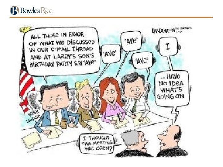 Meetings in a school system contest • With that in mind, what is a meeting? • W. Va. Code § 6 -9 A-2(5) defines a “meeting” as: I. the convening of a governing body of a public agency for which a quorum is required in order to make a decision or to deliberate toward a decision on any matter which results in an official action. Meetings may be held by telephone conference or other electronic means. • Be careful not to have an “accidental meeting. ”