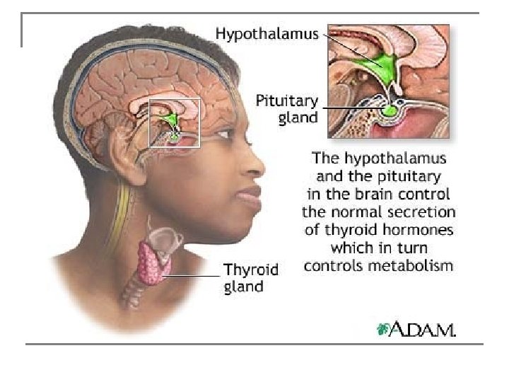 Effects of thyroid hormones n CNS: migration, maturation and myelinization n Growth: Growth factors n Thermogenic effects n Metabolic effects include potentiation of hormone synthesis, glucose transport and stimulation of adrenergic receptor binding