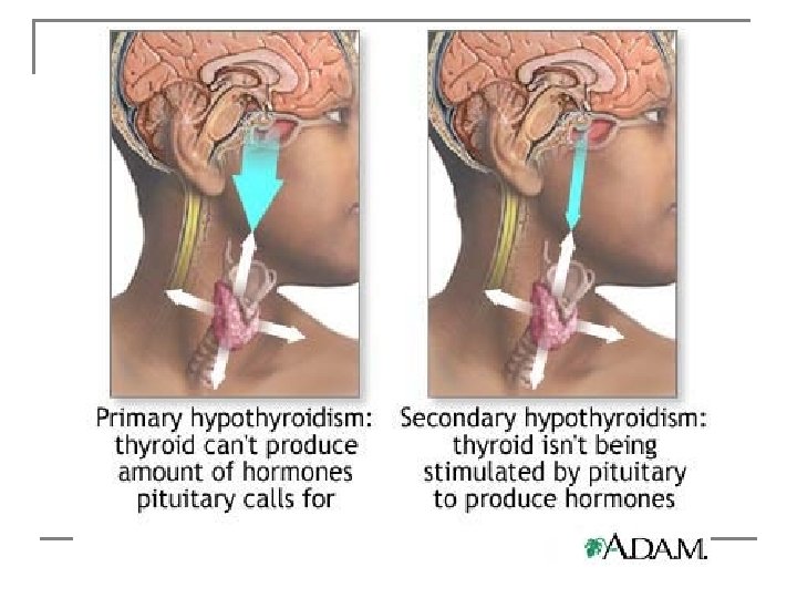 Clinical findings n n n n Macroglossia Large fontanelles Goiter Delayed bone age Poor growth Developmental delay Coarse facial features “good babies” because they rarely cry and sleep most of the time Medscape