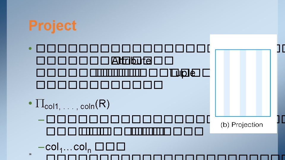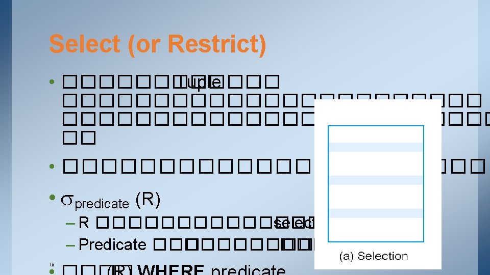 Example - Select (or Restrict) R WHERE Age = 20 R WHERE Sex = 20 19