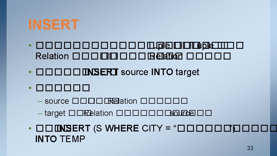 ��������� Relational Algebra • �������������� Relational Algebra ������������� – RENAME – EXTEND – SUMMARIZE – INSERT – UPDATE – DELETE 29