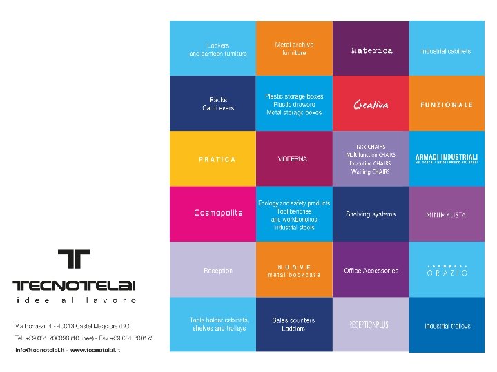 OVERVIEW Since 1967 Tecnotelai researches, manufactures, selects and distributes industrial and office furnishings, being often involved in its customers’ project in order to follow their proper needs. * Italian manufacturing and best materials quality * Complete and efficient assistance service and continuous technical support * Two large showrooms, huge space for ideas and concrete needs www. tecnotelai. it